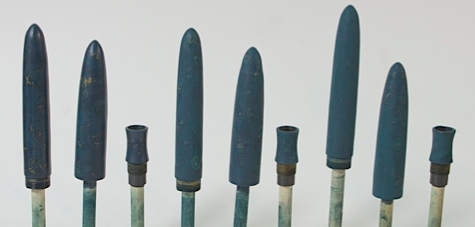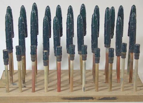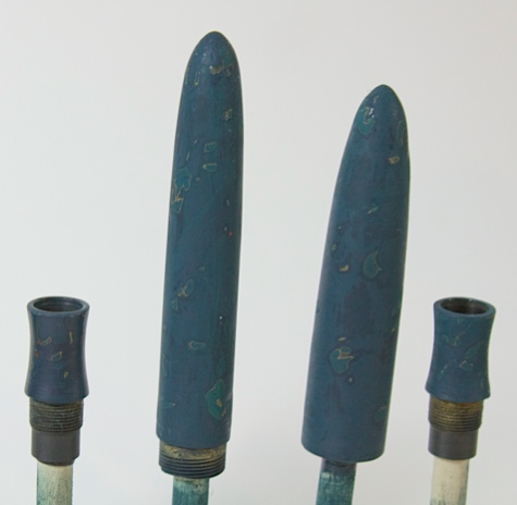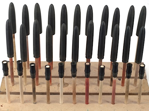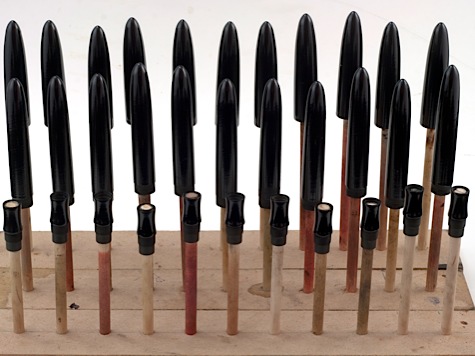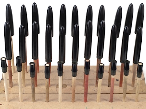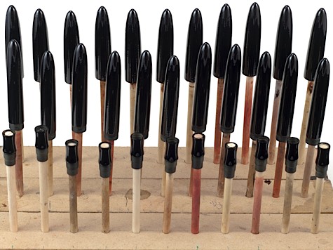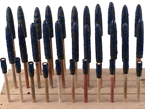 Photo of the unlacquered pens mounted and ready for lacquering. The pens are first washed in with water and detergent and then the parts are fitted onto dowel and then fitted into a base. The parts will be removed or mounted as needed during the lacquer process.